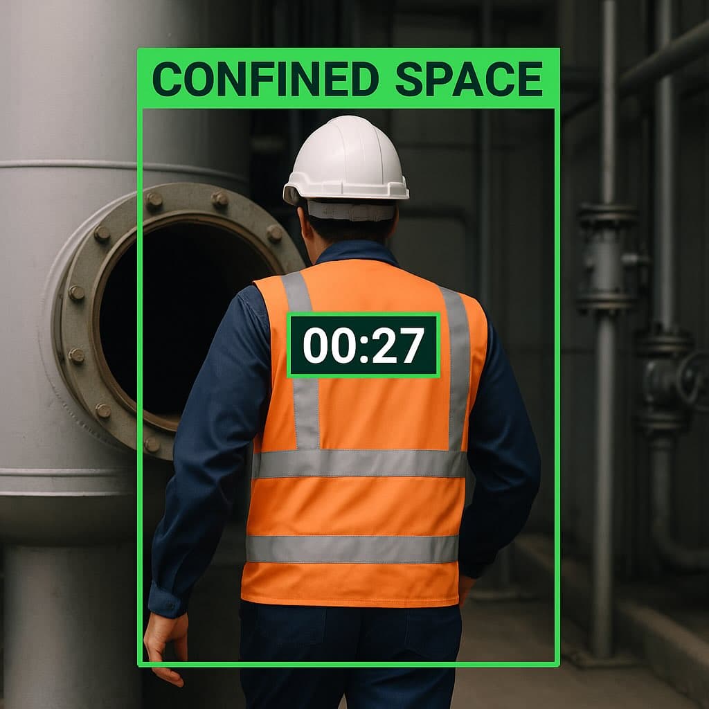 AI-powered vision system that tracks duration spent in hazardous or regulated areas to prevent overexposure and ensure visual compliance with time-based safety protocols